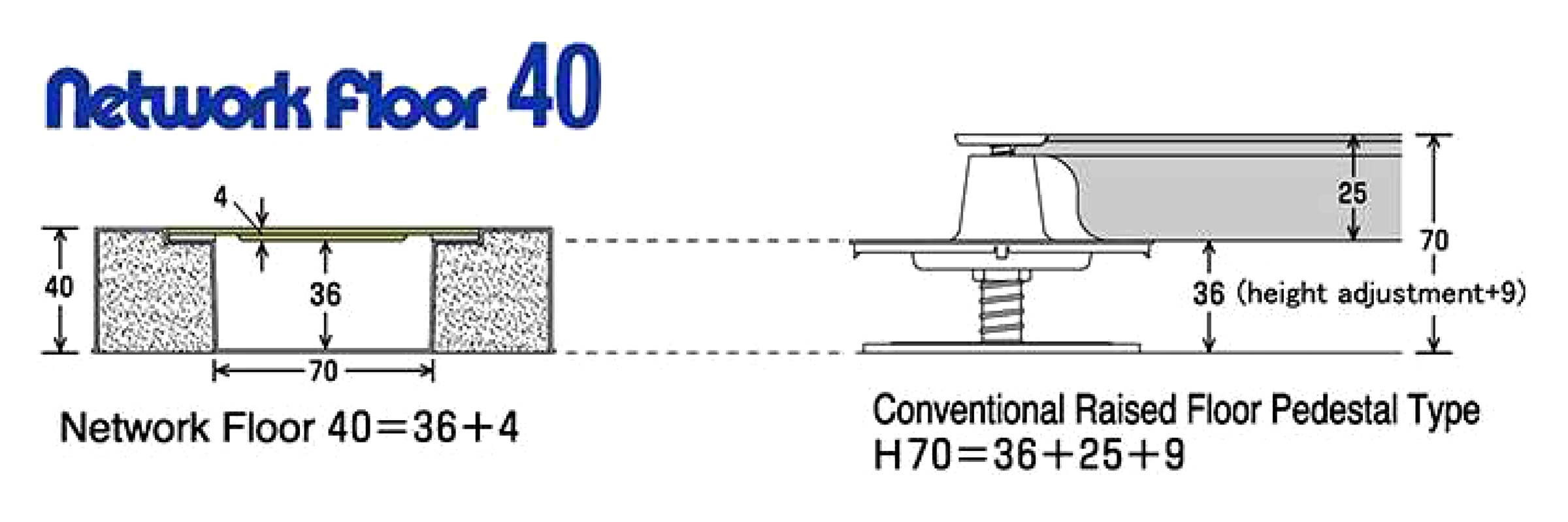 Network Floor has a floor heiQht as low as 40 mm ( 47mm with carpet tiles), minimizing any oppressive sensation caused by effectively lowering the ceiling.