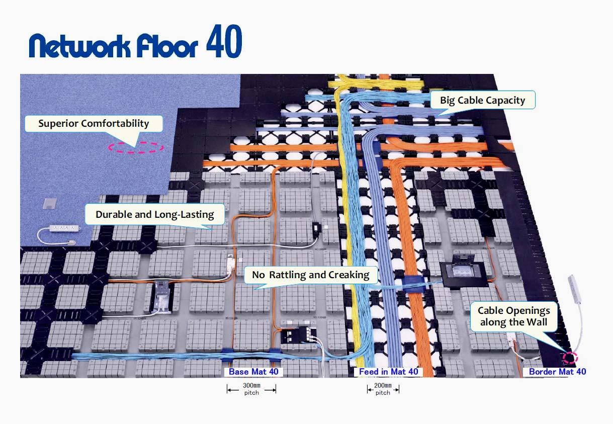 The Network Floor features multi-cabling paths that arrange power, telephone and data lines in separate spaces, and is therefore optimized for applications which use non-shielded paired cables such as LAN.