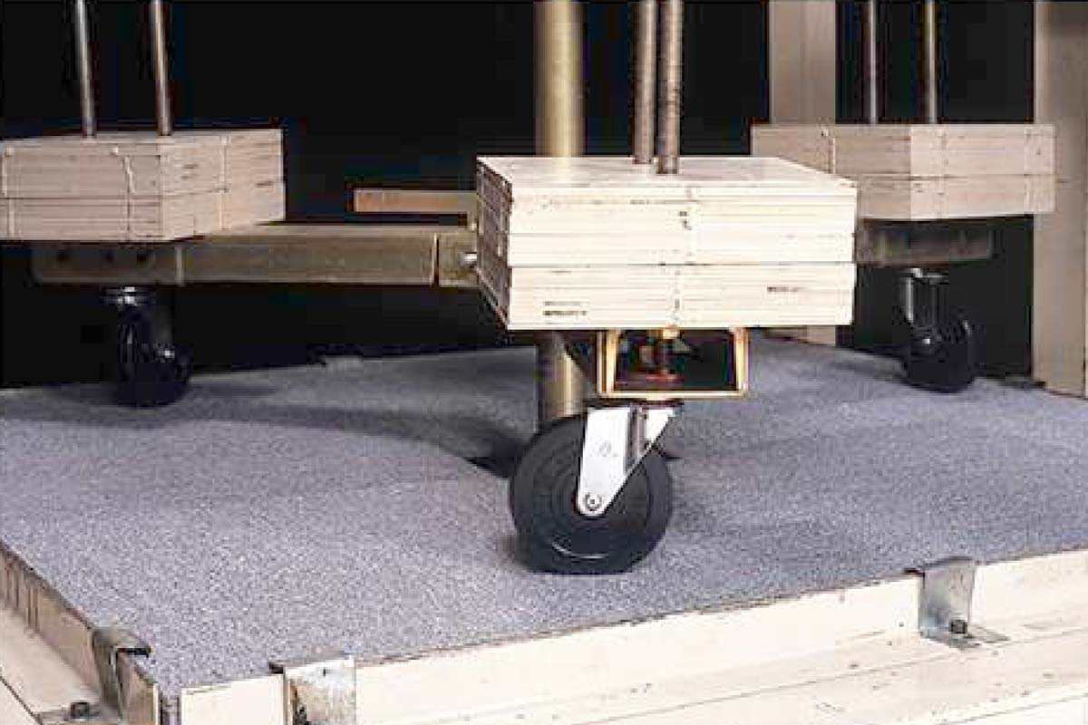 Network Floor was tested for dynamic load in actual conditions, laid over with carpet tiles, for situations where heavy furniture such as wheeled chair, computer, cart or carrier actually moves over it. Using a cart, a load of 75kg/wheel (i.e. with four wheels, a total load of 300kg) was applied to the Network Floor. In this case, it can withstand 250,000 passages of the cart on the same track. Using a chair, a load of 20kg/wheel (i.e. with four wheels, a total load of 80kg: allowing for the weight of a person seated on it) was applied to Network Floor. In this case, it can withstand 1,000,000 passages of the chair on the same track.